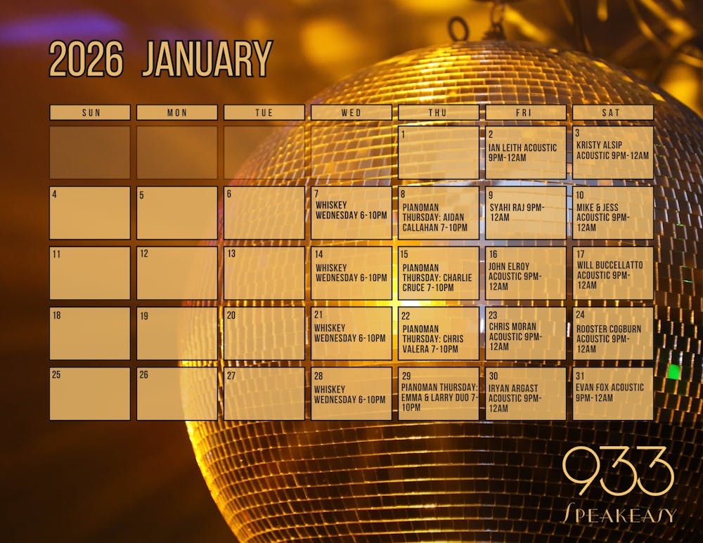 Step into the heart of 933 Speakeasy, where every weekend comes alive with the sound of incredible live music! Join us every Friday and Saturday night for an unforgettable evening of soulful performances, dynamic musicians, and intimate acoustic sets. Whether you're here to dance, unwind, or simply savor the magic of live tunes in our cozy, vintage-inspired atmosphere, 933 Speakeasy is the perfect spot to end your week on a high note. Check out our upcoming lineup and let the music move you!